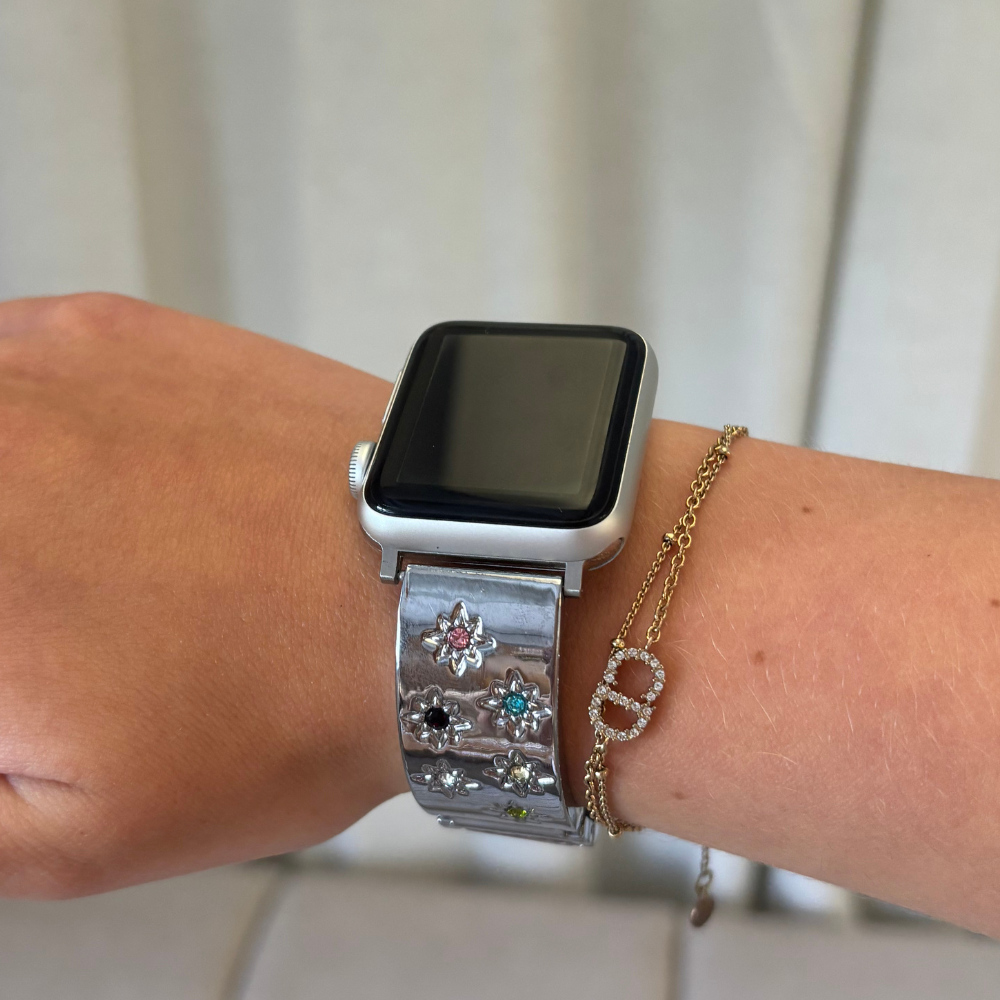 Bring some dreamy, sun-kissed sparkle to your wrist with our Ibiza Coloured Stone Apple Watch Strap in Silver. Designed for the girls who love their accessories sweet, stylish, and just a little bit magical, this strap is dotted with delicate coloured stones that shimmer like a summer sunset on the beach. 💫🌸