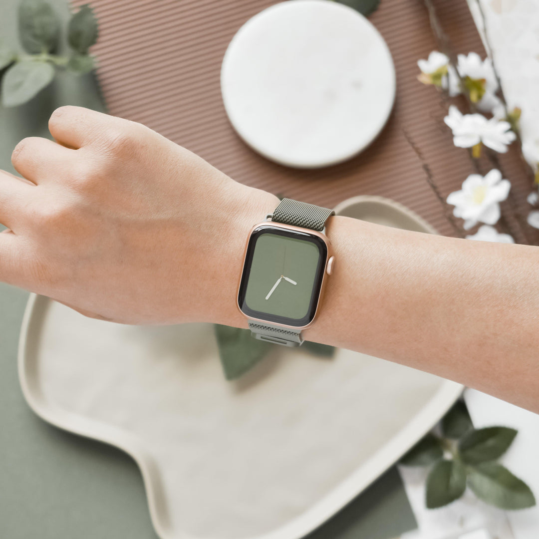 A sleek wristwatch with a green watch face and matching khaki mesh band is elegantly displayed on a white marble coaster. Surrounding the watch are decorative elements, including textured brown surfaces, leafy greenery, and white flowers. The Magnetic Chain Apple Watch Strap - Khaki by Coconut Lane adds both style and functionality.
