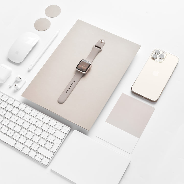 A neatly arranged display of Apple products including an iPhone, an Apple Watch with the NAKD Mocha strap by Coconut Lane, AirPods, a wireless keyboard, a Magic Mouse, and an Apple Pencil on a white desk. The items are organized in a visually pleasing layout with the Apple Watch displayed centrally on a beige booklet.