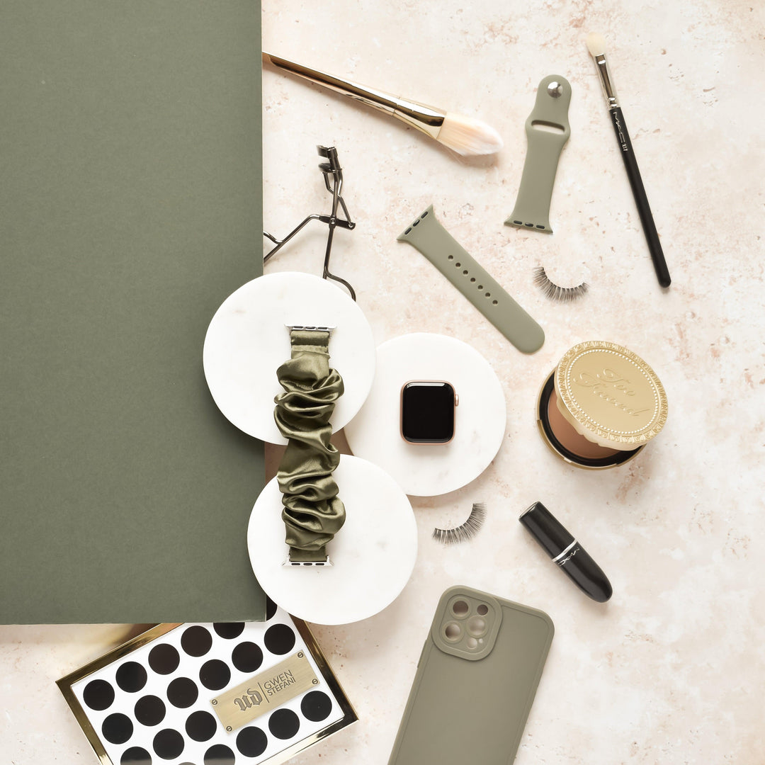 Satin-Green-Scrunchie-Apple-Watch-Strap-Band-Flat-Lay