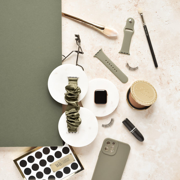 Say hello to our Vintage Khaki Apple Watch Strap in a unique Scrunchie wrist band design. This silky satin will bring timeless comfort and a sprinkle of understated glam to your every day.