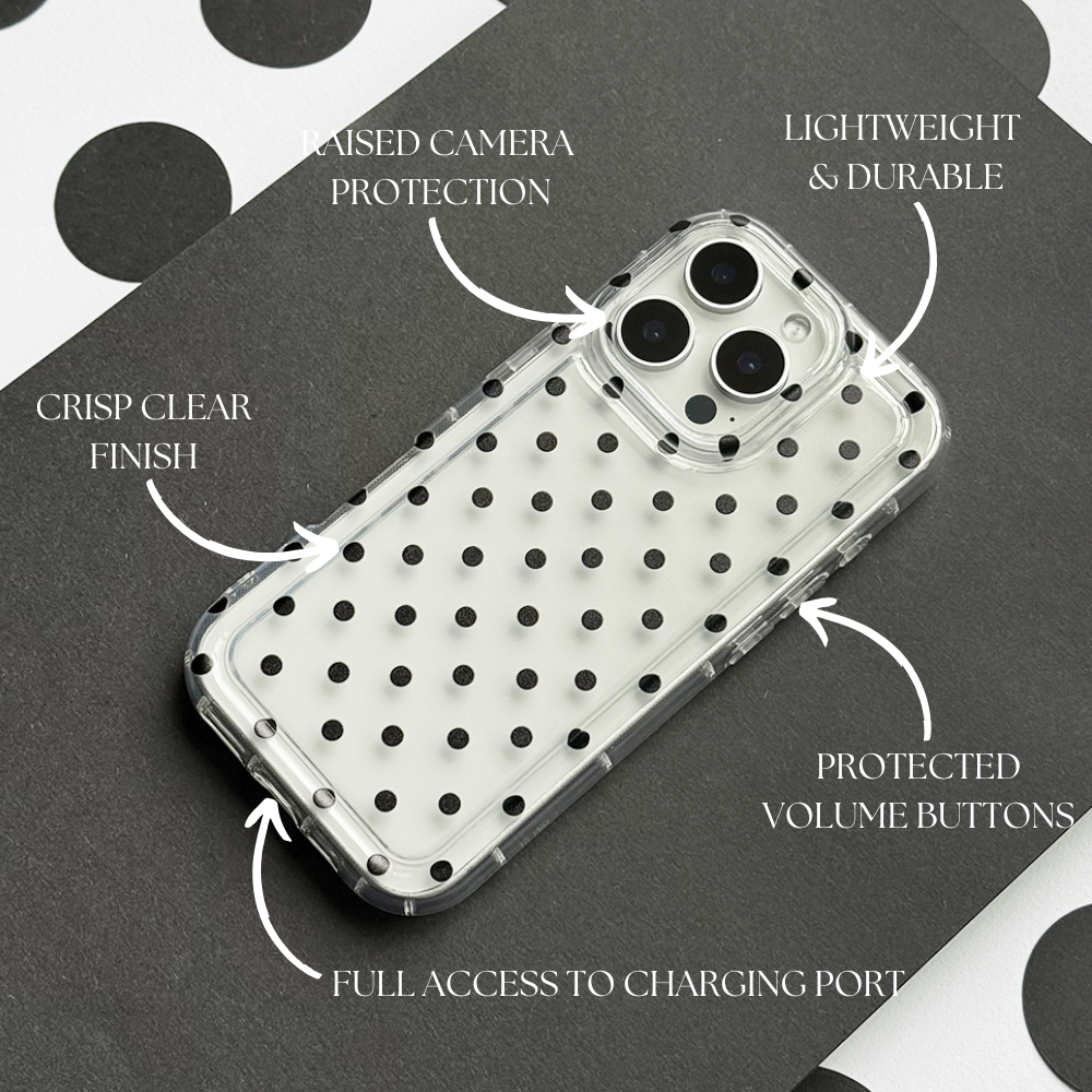 Our Clear Phone Case – Black Polka Dot is a classic with a playful twist, featuring dainty inky dots scattered over a crystal-clear base so your phone’s natural beauty still shines through. She’s lightweight, protective, and oh-so-versatile – the kind of case that goes with everything in your wardrobe.
